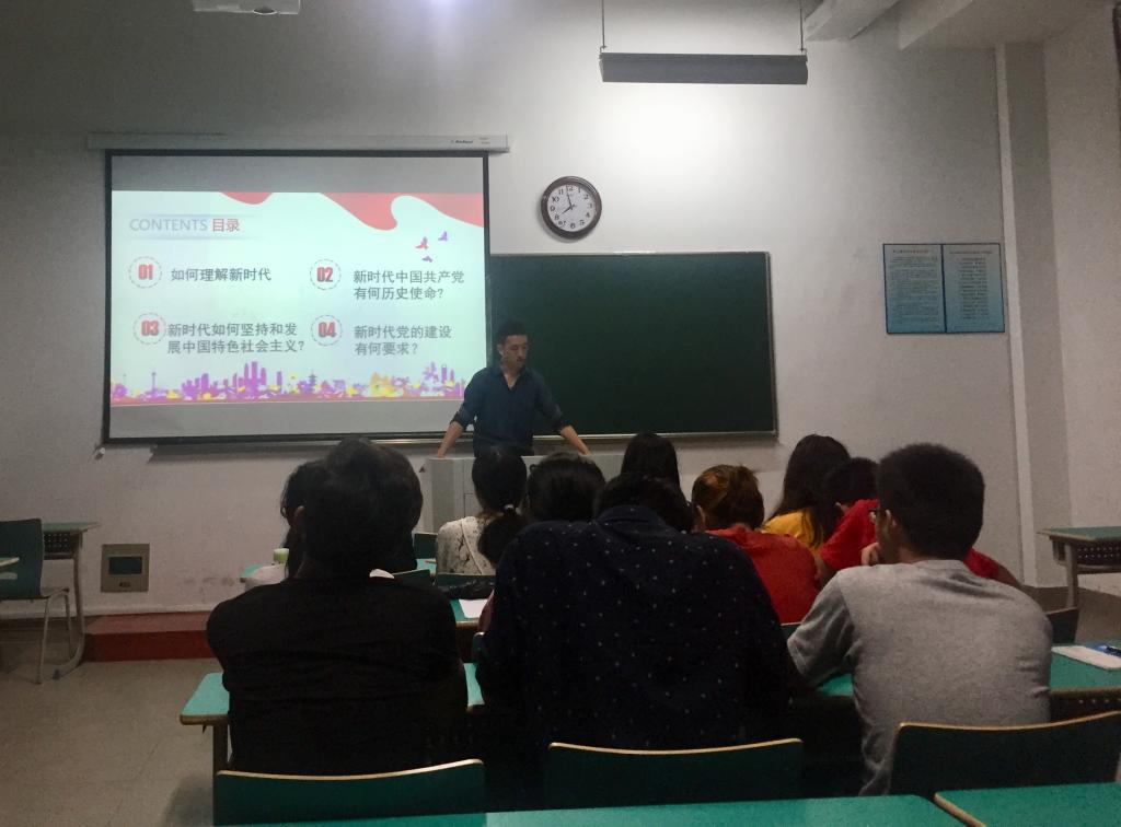 随后,在工科楼102教室,支部书记付宗国上一堂以学习习近平新时代中国特色社会主义思想为主题的党课,支部书记付宗国讲解新时代中国共产党的历史使命、新时代如何坚持和发展中国特色社会主义等内容,引导广大学生党员进一步增强“政治意识、大局意识、核心意识、看齐意识”、坚定“中国特色社会主义道路自信、理论自信、制度自信、文化自信”,始终信党、爱党、跟党走。