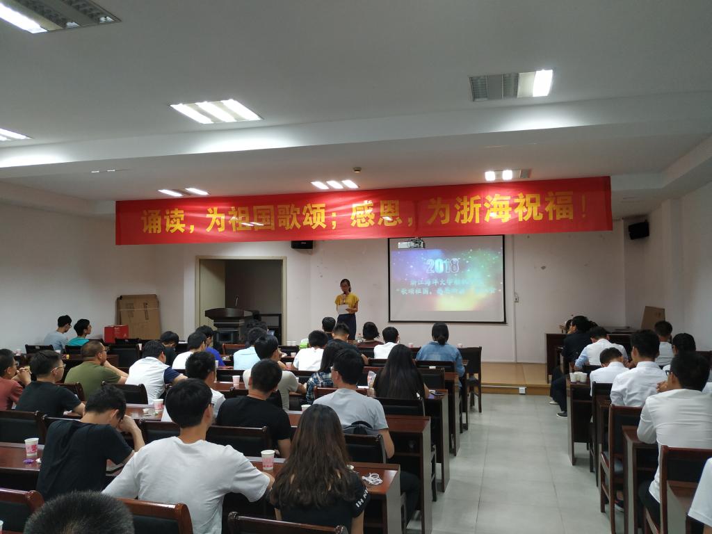 9月28日,在第69个国庆节,浙江海洋大学建校60周年到来之际,浙江海洋大学船舶与机电工程学院举行“歌颂祖国 祝福浙海”研究生朗诵会,船舶与机电工程学院党委副书记何晔出席,研工办房艳艳、学工办付宗国、船舶系李国强等老师以及包括留学生在内的船机学院研究生参加本次朗诵会。