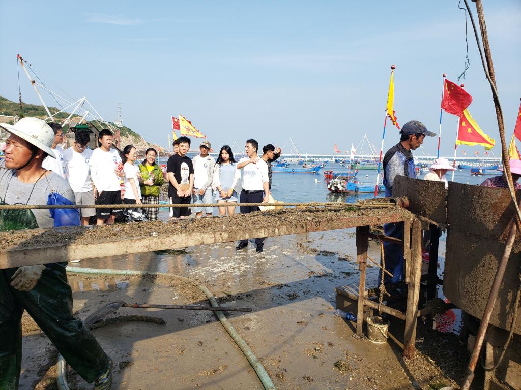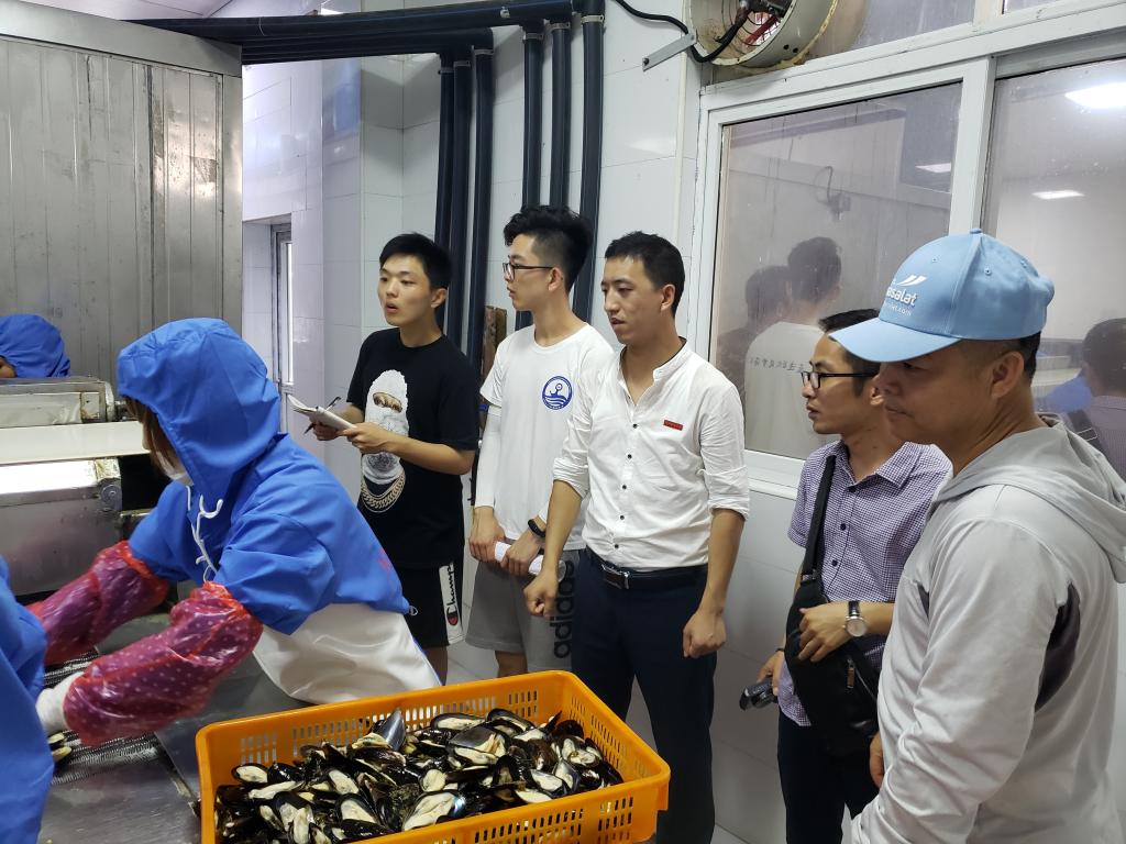 实践团来到景晟贻贝生产基地一线,在热火朝天的码头上,各项贻贝作业紧张忙碌有序,从渔民将贻贝种苗脱落,进行贻贝包苗。码头上吊机将渔船上贻贝起吊上岸,脱落机将贻贝脱落,接着贻贝进行清洗处理,通过现场过程了解贻贝各个环节技术,提出改进方案,促进作业环境改善,减少人工投入,提高作业效率,适应“机器人换人”大趋势。在嵊泗县景晟贻贝产业发展有限公司,实践团成员了解到该公司主要经营贻贝育苗、保苗;速冻食品和预包装食品生销售;水产新技术、新品种开发及技术培训、技术咨询服务等。实践团深入生产车间观摩贻贝去壳、冷藏、筛选等加工技术,与车间负责人探讨技术改进。