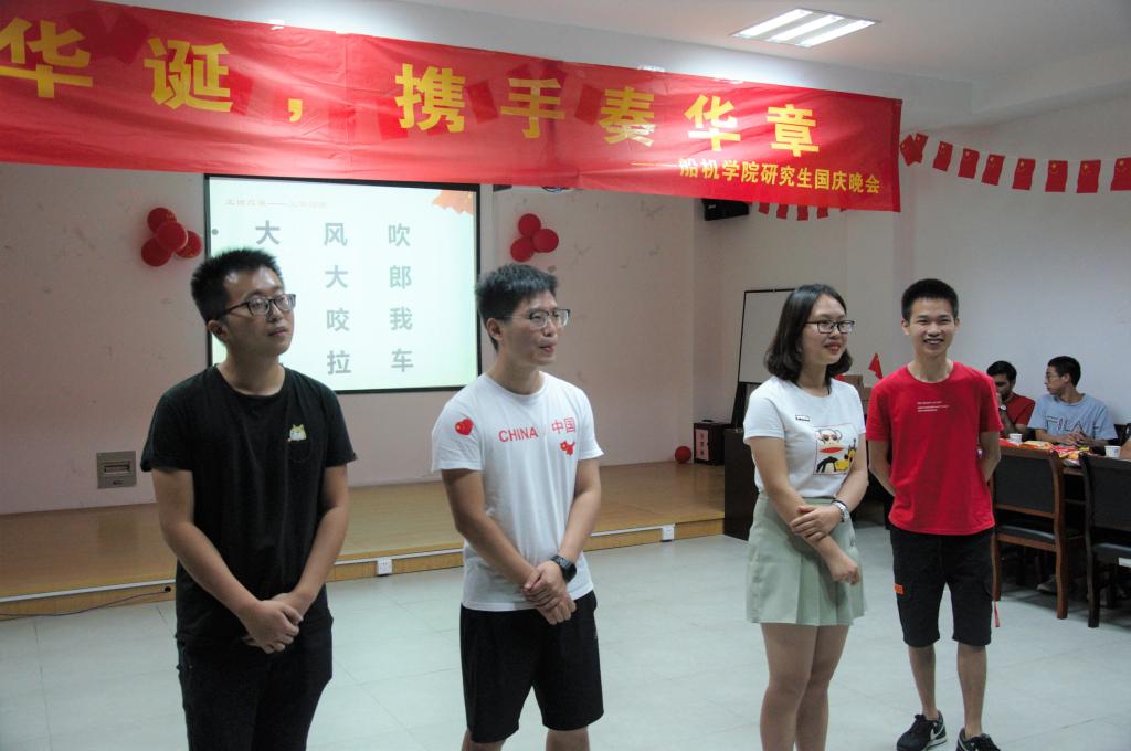 为迎接中华人民共和国成立70周年,充分展示研究生的才华,增强研究生集体的凝聚力,丰富研究生业余文化生活,陶冶研究生爱国主义情操。9月28日晚上,船舶与机电工程学院在工科楼119会议室举办“与国庆华诞,携手奏华章”研究生国庆晚会,出席本次晚会的有研究生工作相关的老师以及全体研究生。